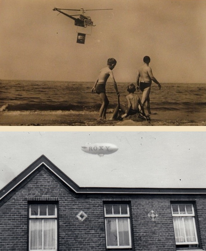 In het toeristenseizoen, als het strand dichtbevolkt was, konden er alle soorten reclames worden uitgestort boven de hoofden van de autochtone én allochtone badgast. Er waren vliegtuigjes die hoog in het blauwe zwerk met hun luchtstrepen ‘ROXY’ tekenden en als het daarboven een beetje windstil was, bleven die letters nog lang leesbaar ook. Vaak kwamen er vliegtuigjes voorbij met een reclamesleep (‘Durex: the best there is!’). Maar mooier was die helicopter die laag over zee de ene keer reclame maakte voor Nescafé oploskoffie (zoals hier), maar net zo goed ook langsvloog met het sigarettenmerk ‘Hunter’ op de flanken. En dan was er die heuse zeppelin, ook van Roxy-sigaretten. Dat was eigenlijk de mooiste van allemaal (zij het dat het aangeprezen produkt wat minder was).
