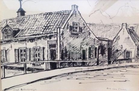 cor van duin is een rijnsburger…eigenaar hotel…noordzee…tekend als hobby…huisjes onder de seinpost…oude werkplaats schuur…bomschuiten…