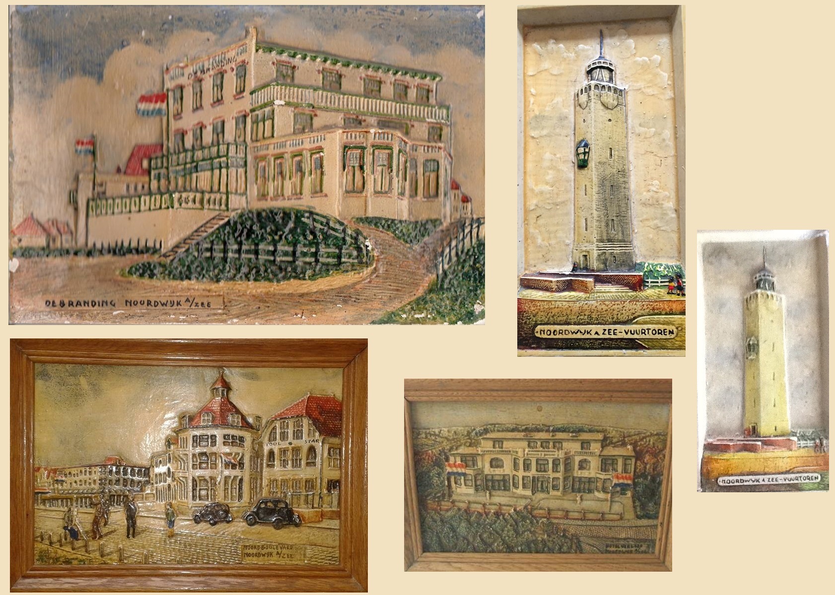 Hoe moet je ze noemen? Reliëfschilderijen? Vermoedelijk gemaakt van gips en met de hand ingekleurd? Soms geglazuurd daarna? Ik weet er niks van af. Ik had tijden geleden zo’n beeld opgenomen van Hotel Verloop. Nu duiken op “Je bent een Noortukker” nog andere voorbeelden op: van Noordzee en van De Branding. En twee van de vuurtoren. Zijn er nog meer?