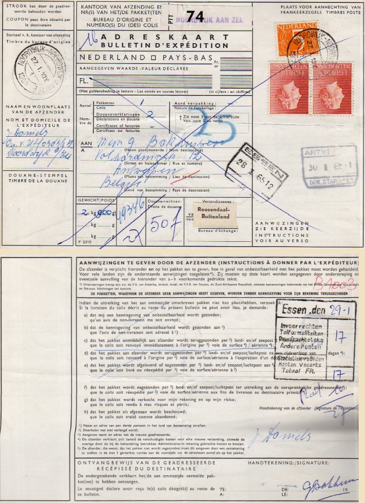 Voordat je een pakketje van Noordwijk aan Zee (meer in het bijzonder van de Quarles van Uffordstraat) naar Antwerpen (meer in het bijzonder de Volhardingsstraat) had, moest er nog flink wat geregeld worden aan administratie: 2 douaneverklaringen, 1 uitgebreide adreskaart met de juiste stempels, een stickertje Roosendaal/Buitenland en veel handtekeningen. En dan moest er bovenop de portokosten ook nog eens 50 BF betaald worden aan douanerechten. Dit hele verhaal ging op 27 januari 1965 het land uit.