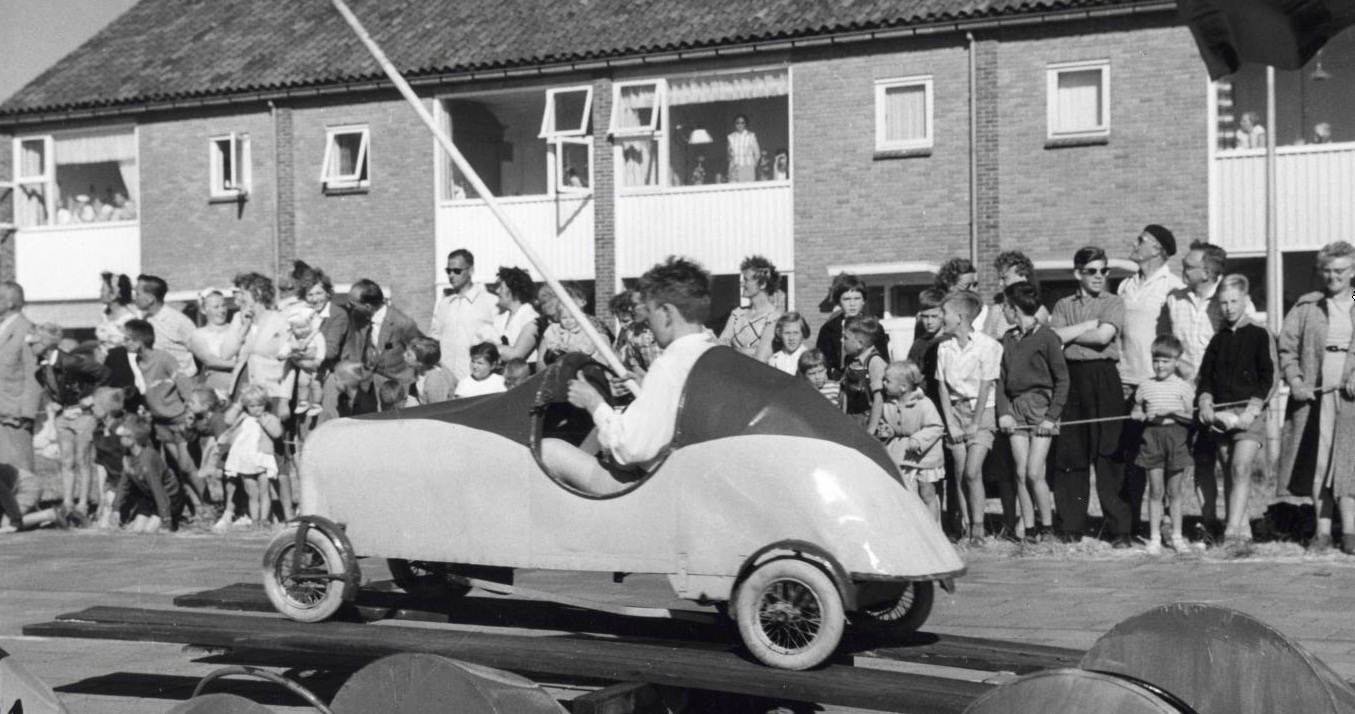 Er zijn hier wel vaker foto’s langs gekomen van de autorenbaan ‘Flying Arrow’ aan de Golfweg. Hard trappen en zien wie het eerste thuis was. Maar dit was anders: dit vergde stuurmanskunst, evenwichtskunst én stalen zenuwen. Want je ging met de trapauto over een wip, moest rechtdoor blijven sturen en ook nog eens die stok door een ringetje steken. Niks ‘Flying’, maar louter ‘Balancing’ (foto: gahetna.nl).