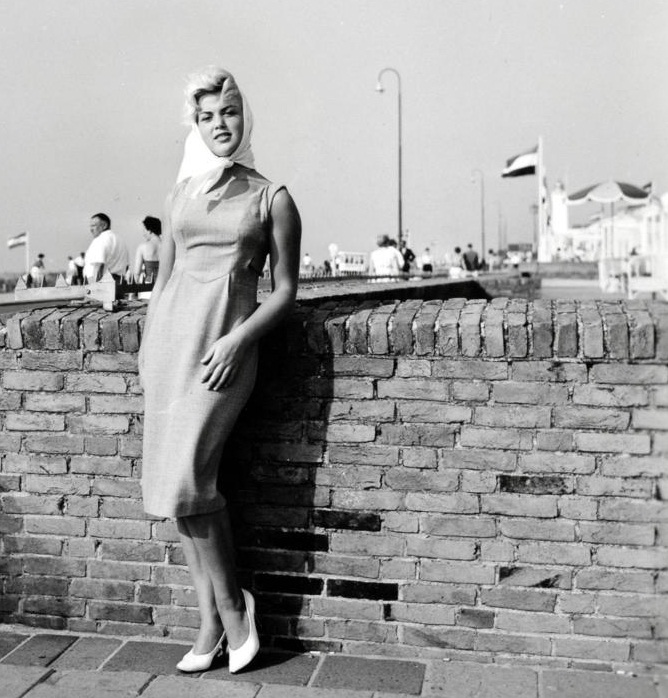 We weten niet wie deze schone is die in 1959 poseerde op de Noordboulevard in Noordwijk. Het zou de zus van Marilyn Monroe kunnen zijn of het verstoten nichtje van Brigitte Bardot. In 1959 was ik nog te jong om haar op te merken, maar later zou ik gewenst hebben dat ze er nog stond (foto: gahetna.nl).