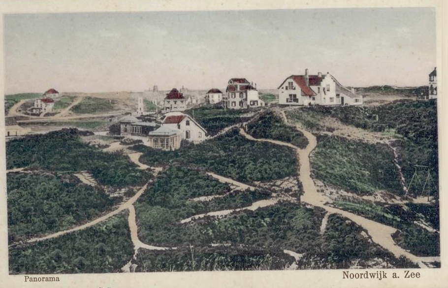 Kronkelende paden door het duin, die zich allemaal een weg banen richting een badplaats met nieuwe allure: de lawntenniscourts van de Noordwijksche Sportvereeniging zijn in aanleg, symbolen van nieuwe, mondaine ambities. De villa’s rondom kijken welgemutst toe. Noordwijk als badplaats begint kleur te krijgen, al is het maar met enkele vlekken donkergroen en rood voor de daken van de huizen.