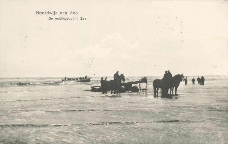 De mannen met peerden wachten op de roeireddingboot, die op de houtentellage moet worden getrokken om vervolgens weer naar de redschuur aan de Schoolstraat te worden vervoerd. De fotokaart werd uitgegeven door Jan van Kan, wie anders? Hij was de schipper op de boot.