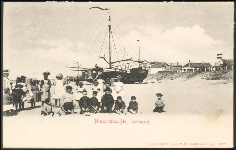 S. Bakker Jz. uit Koog – Zaandijk had er met zijn lichtdrukinstallatie erg zijn best op gedaan. Een plaatje van poserende kids ,met anderhalve volwassene voor een paar bomschuiten aan het Noordwijkse strand. Hier en daar staan al een paar badstoelen en bij Badhotel Konijnenburg hangt de vlag in top. S.Bakker Jz. fotografeerde de overgang van de oude naar de nieuwe tijd. Van vissersplaats naar badplaats.