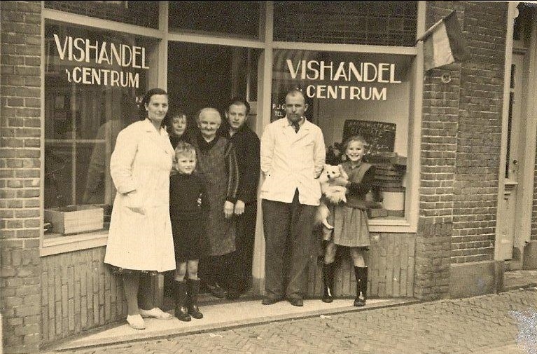 Overigens: de winkel was altijd gewoon open, ook wanneer mijn vader op de boulevard stond. Pas na 1968/69 bleef de winkel gesloten omdat de omzet niet opwoog tegen de arbeidstijd die het openhouden vergde. Op bovenstaande foto was ik nog niet geboren, erop te zien zijn van links naar rechts: mijn moeder, oudste broer Jan, jongste broer Kees, Opoe van vaders kant, Frans Steenvoorden, mijn vader en mijn zus Gerda met in haar armen hond Sonja. Ter gelegenheid waarvan de foto is gemaakt is me nooit helder geworden, al denk ik dat het kermistijd was vanwege de paling in de etalage.