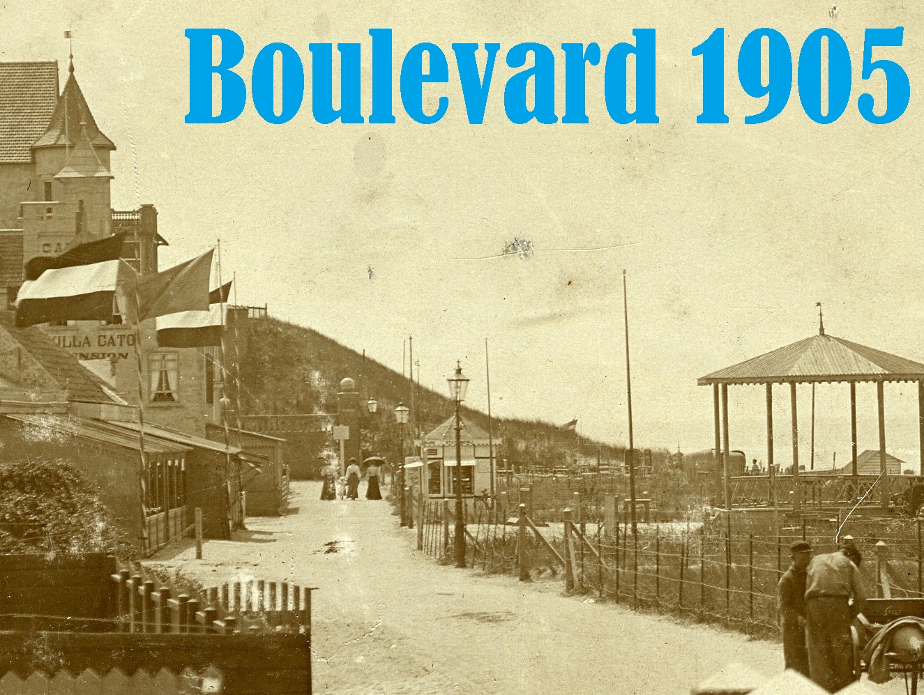 Rechts een muziektent. Dat geeft toch wel een speciale atmosfeer met ’s middags of ’s avonds muziek. Dat kennen Engelse badplaatsen nog steeds en oh, wat is dat vreselijk gezellig ! Zo gezellig moet Noordwijk wellicht ook 110 jaar geleden geweest zijn.