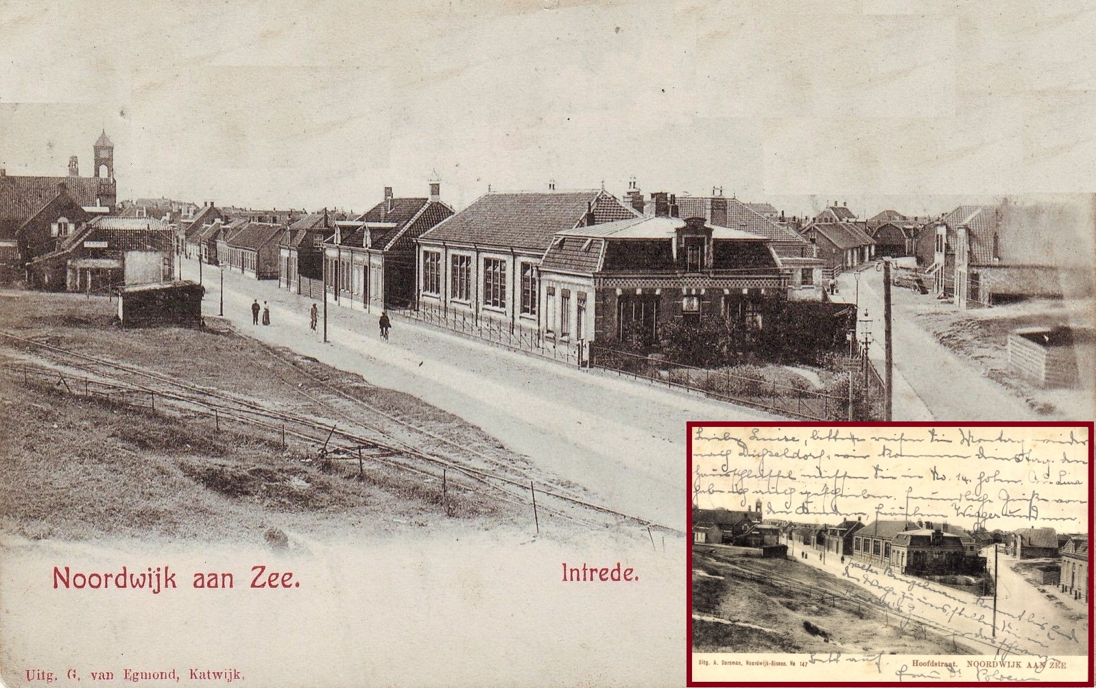 Het is (vrijwel) dezelfde kaart, de ene keer uitgegeven door G. van Egmond te Katwijk, de andere keer door A. Dorsman te Noordwijk-Binnen. Misschien wisselden beide uitgevers onderling hun fotobestanden wel uit, of pikten ze van elkaar. Of Dorsman nam op enig moment Van Egmond over. Of zoiets. Twee keer klikken op de foto en je kunt het preciezer bekijken.