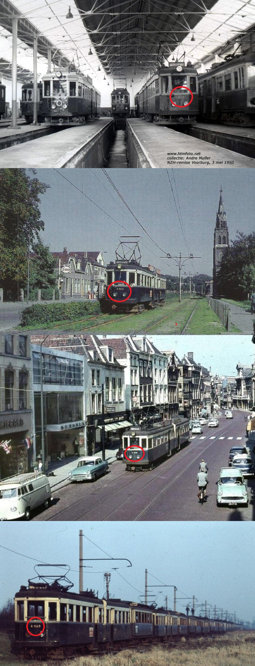 De A603 behoorde tot een serie trams, die speciaal voor de NZH gebouwd werd door de firma Beynes in Haarlem. De eerste modern gelede trams van Nederland, zomer 1932. De A-serie zou in zijn soort net zo vermaard worden als de Budapesters, waarmee de NZH eveneens de straten onveilig maakte in de driehoek Haarlem-Leiden-Den Haag. Mooie en redelijk luxueuze trams, ik zou er graag nog eens een ritje mee maken van Noordwijk naar Leiden en weer terug.