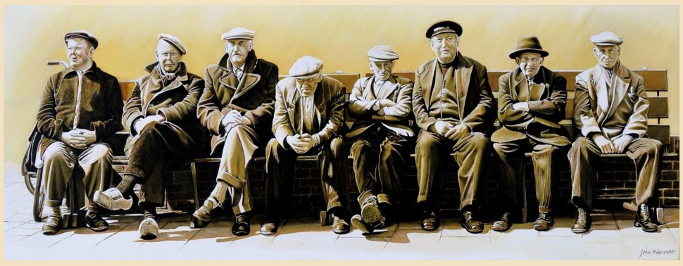 Ik kom van het bankje een schilderij van John Wassenaar tegen op internet. Het schilderij heet dan ook ‘prossies’. Prachtig eerbetoon aan deze oude mannen, van wie ik bijna alle namen vergeten ben. Bijna, want – helemaal links – herken ik Doris Janson (“Doris Mol”) nog als enige (‘enigste’, zeggen ze vaak in Noordwijk).