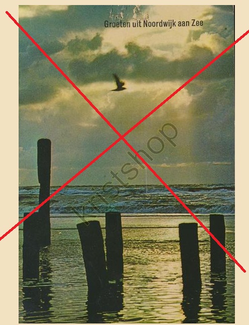 De Kristshop heeft bij voorbaat maatregelen genomen om het kopiëren van deze kaart onaantrekkelijk te maken, door zijn naam er dwarsoverheen te projecteren. Men had zich de moeite kunnen besparen. De kaart is sowieso volstrekt onaantrekkelijk, want één grote fake. Deze foto is niet in Noordwijk genomen (dit palen staan er niet), hoezeer de uitgever van de kaart (de gebroeders Spanjersberg in Rotterdam/Antwerpen) en Kristshop ook het tegendeel zullen willen beweren. Vernaggelarij van de bovenste plan. Ik maak ‘m nog onaantrekkelijker en haal er een stevig kruis doorheen. Vijfenzeventig eurocenten durft Kristshop hiervoor nog te vragen. Tjongejonge.