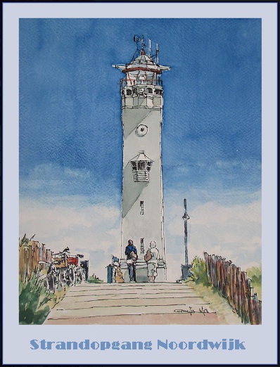 Cornelis maakt prachtige aquarellen, waaronder deze van de strandopgang bij de Vuurtoren in Noordwijk.