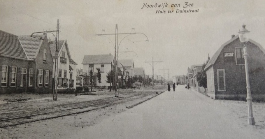Een beeld van de Huis ter Duinstraat dat ik in ieder geval nog niet kende. Het is al voorbij 1912, want de tramlijn is al danig geëlektrificeerd. In mijn herinnering lag dit laatste stukje trambaan naar het eindpunt op hetPicképlein er altijd een tikkeltje stoffig bij. Er was niet veel werk gemaakt van bestrating of begroeiing of keistenen tussen de rails. Rechts op de zijkant van het pand dat de weg verdeelt in Huis ter Duinstraat en Abraham van Royenstraat hangt een emaille reclamebbord van Vesta Verzekeringen.