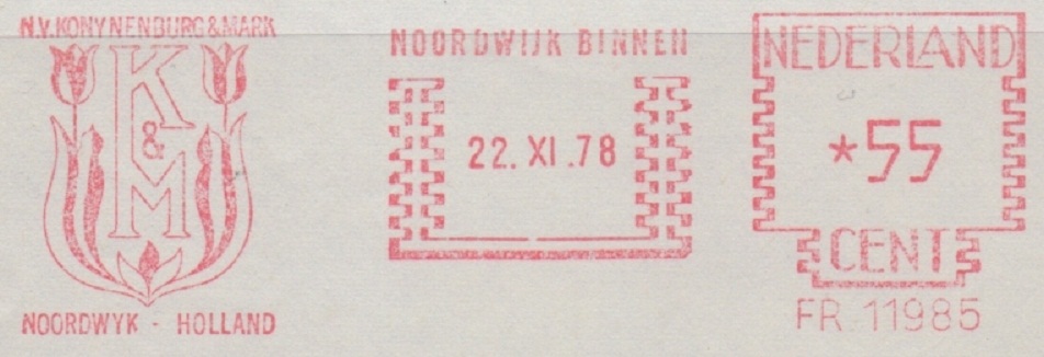 Een frankeermachine is een apparaat dat een frankeerstempel zet in plaats van een postzegel. De frankeermachine maakt het voor bedrijven makkelijker om grote hoeveelheden post te versturen. In het stempelvlak wordt vaak een reclameboodschap van het bedrijf geplaatst. Voordeel van het gebruik van de frankeermachine is dat men kan frankeren voor een voordeliger tarief. Bij Konijnenburg & Mark hadden ze ook zo’n apparaat en ze hadden er met hun logo ook een mooie reclameboodschap in gebracht. Ikzelf heb nog een tijdje van dit soort stempels verzameld, naast mijn reguliere postzegelverzameling, strafportzegelverzameling, eerstedagenveloppenverzameling, speldjesverzameling, sigarenbandjesverzameling en luciferdoosjesverzameling. Alleen de postzegels heb ik nog, hoewel er de laatste 30 jaar niks meer is aangevuld. De rest is weggedaan, weggegeven en – wat betreft de luciferdoosjesverzameling – in de hens gegaan. Dat gaf nog een mooi effect!