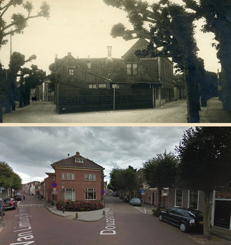 De bovenste foto is van 1928 en de kruising stelde niet veel voor: een verzameling van oude huisjes, anderhalve bollenschuur en een schutting, waarop in vage letters nog drie keer ‘Shell’ te lezen valt. De lindenbomen hebben het sedertdien ook niet meer overleefd. Het nieuwe pand op de onderste foto werd later bewoond door de familie Tromp. Ik heb het altijd een bijzonder huis gevonden op een bijzondere plek: als het begin van een volgebouwde vluchtheuvel tussen Douzastraat en Van Limburg Stirumstraat in.
