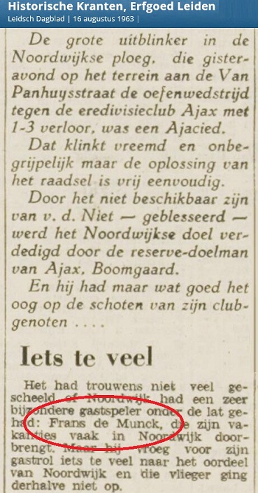 - Op donderdag 15 augustus 1963 – Maria Hemelvaart – speelde de vv Noordwijk een vriendschappelijke wedstrijd tegen Ajax. Doelman Jaap van der Niet van Noordwijk was geblesseerd en een volwaardige stand-in kon blijkbaar niet geregeld worden, want uiteindelijk stond ene Boomgaard onder de lat bij Noordwijk, nota bene de reserve-keeper van Ajax! De vv Noordwijk had nog moeite gedaan om Frans de Munck onder de lat te krijgen, die blijkbaar in Noordwijk bivakkeerde. Frans de Munck wilde wel meedoen met Noordwijk, maar hij vroeg volgens het Leidsch Dagblad veuls te veul geld. Hoeveul is niet bekend, maar wat mij betreft was het altijd te weinig geweest, als de Panter maar ooit de grassprieten aan de Van Panhuys met zijn noppen had gestreeld.