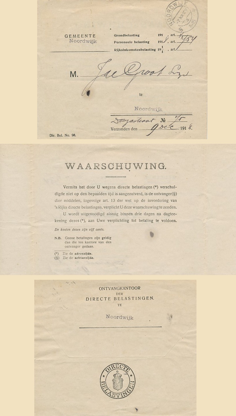 De Groot in de Douzastraat had op 7 december 1918 (poststempel) nog een achterstallige belastingbetaling te voldoen en daartoe kreeg hij van de Ontvanger der Directe Belastingen van het Kantoor Noordwijk de missive om één en ander binnen drie dagen te voldoen. En niet via een girootje of zo, maar in hoogsteigen persoon en contant op het kantoor van de Ontvanger (ik vermoed dat die toen ook al aan de Pickéstraat zat?) De 7e december viel dat jaar op een zaterdag en de Ontvanger matste De Groot een beetje, want hij schreef erbij dat de boel pas op 9 december verzonden zou zijn. Scheelde De Groot toch nog twee dagen.