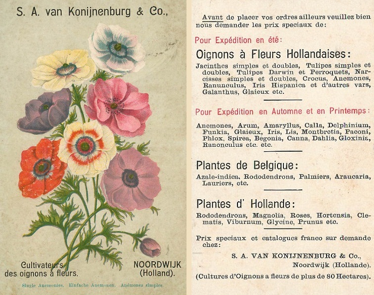 S.A. van Konynenburg (“Siem Knijn”) was één van de meest befaamde bloembollencultuurbedrijven in Noordwijk, zo niet in de hele Bollenstreek. En niet alleen omdat mijn grootvader er het grootste deel van zijn leven werkzaam is geweest. S.A. van Konynenburg stond voor kwaliteit en internationaal en goede smaak, zoals deze ‘flyer’ nog eens genoegzaam laat zien.