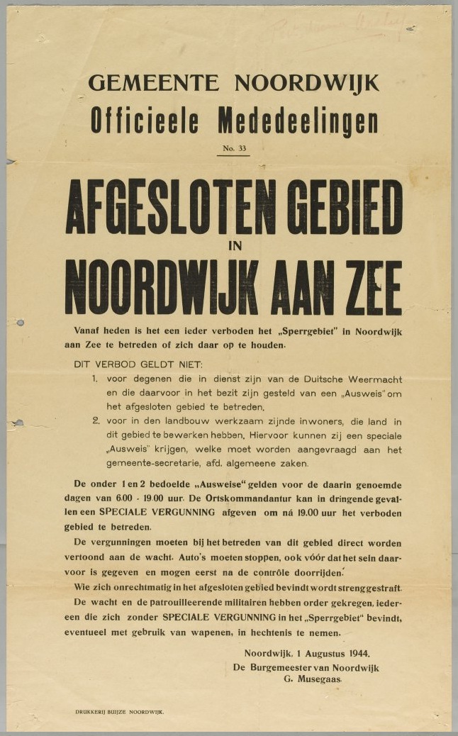 “Sperrgebiet” klinkt toch wat beeldender dan “Afgesloten Gebied”, maar het idee was hetzelfde. Een gedeelte van Noordwijk aan Zee was in de oorlog ontoegankelijk verklaard behalve voor anderhalve man en paardekop van de Duitse ‘weermacht’ en voor Noordwijkse boeren, die in het afgesloten gebied land te bewerken hadden.