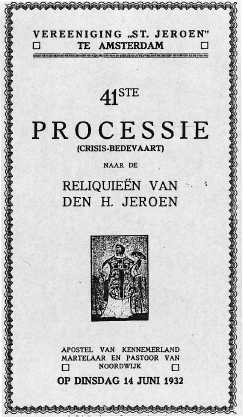 Er werd van alle kanten richting Noordwijk bedegevaren, aan belangstelling mocht het de Heilige Jeroen vóór de oorlog niet ontbreken. Maar in de Jaren dertig was er op eens meer belangstelling. Vanwege de werkloosheid en de crisis. En vanwege de veronderstelling dat de Heilige Jeroen wel even korte metten zou maken met die werkloosheid én die crisis. Quod non. De Heilige Jeroen was geen wonderdoener, ook al geloofden vele Noorwijkers dat wel. Tegenwoordig zijn er mensen (en niet de minsten!) die menen dat Jeroen helemaal niet eens ‘heilig’ is. Allemaal voor niks geweest, die crisisbedevaarten?