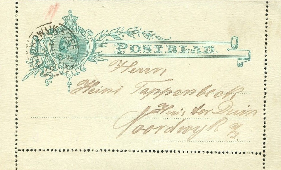 Op 4 december 1896 stuurde iemand vanuit Noordwijk een krabbeltje aan Heini Tappenbeck in Huis ter Duin. Ik neem aan – koosnaampje – dat hier niet de oprichter-directeur van Huis ter Duin, Heinrich Tappenbeck, werd aangeschreven, maar diens zoon Heinrich Christian Tappenbeck (1880-1950). Op het moment van schrijven was ‘Heini’ dus 16 jaar oud. Benieuwd wat er in de brief stond en van wie die afkomstig was.