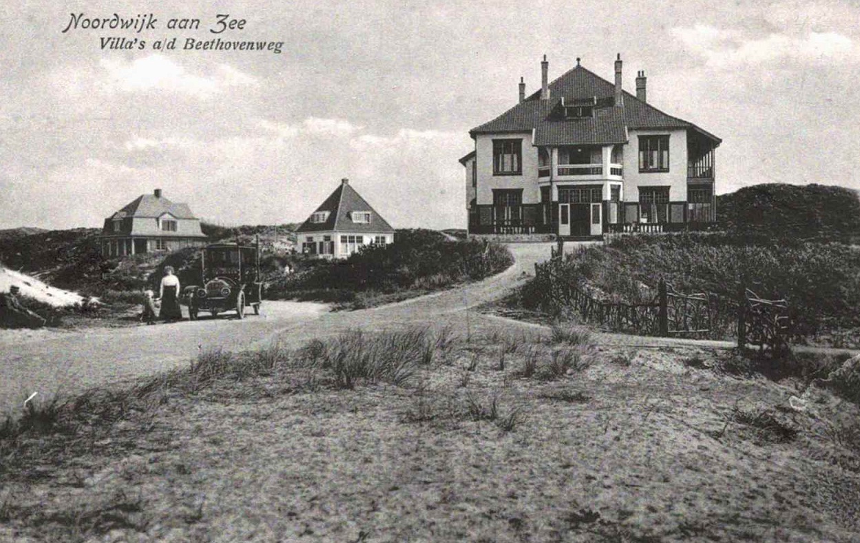 In het bijschrift wordt de aandacht gevestigd op enkele villa’s aan de Beethovenweg in Noordwijk aan Zee, waaronder Belvedere in haar oorspronkelijke staat. Maar ik zou graag het merk en type willen weten van die auto die daar net aan komt rijden of geparkeerd staat. Twee keer klikken en wie het weet mag het zeggen. Graag zelfs.