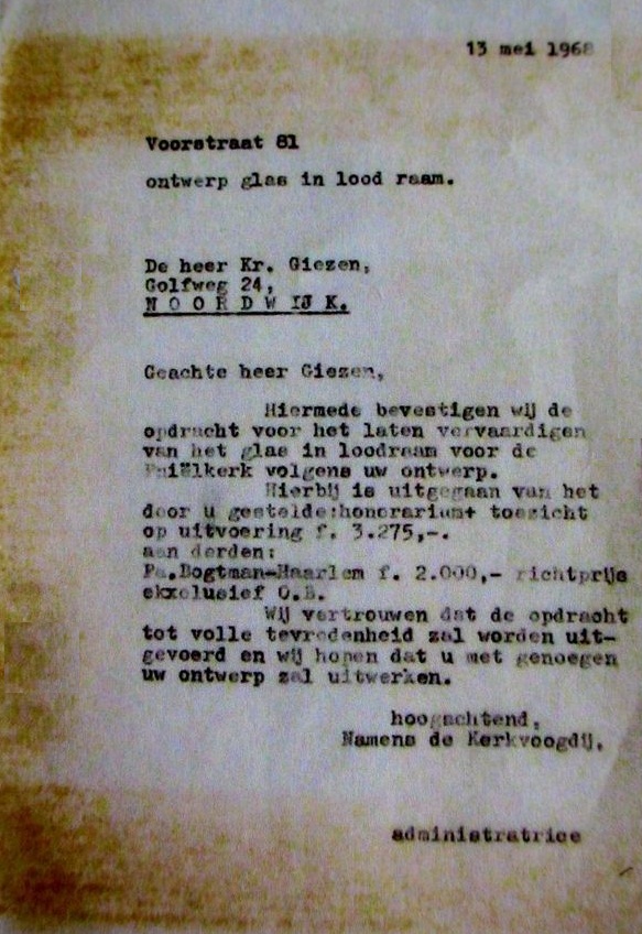 Op een informatieve “glas-in-lood-site” is de hele aanbesteding met bijbehorende correspondentie opgenomen. Ik pik er één bief uit: van de Hervormde Gemeente aan Giezen (die toen nog aan de Golfweg in Noordwijk aan Zee woonde, later verhuisde hij naar de Voorstraat in Noordwijk Binnen).