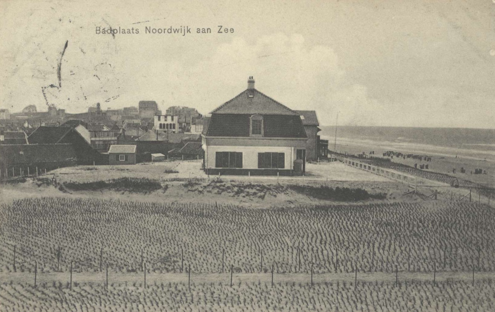 Het beeld is van 1907 en het laat de pas gebouwde villa zien, die we later kenden als “Seinpost” (ik geloof dat de villa eerder anders heette). Op de voorgrond het aangeharkte duin, met helm beplant, waar kort daarna de villa’s Golfzang, Wehme en De Loods zouden verrijzen. Maar “Seinpost” is nog gloednieuw, keurig tot in de puntjes afgewerkt, het erf rondom net opgeruimd.
