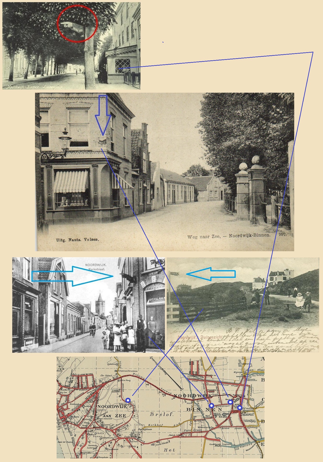 We hadden eerder al een paar mooie aanwijsborden richting Zee, te beginnen aan de Voorstraat bij het Hof van Holland. Vandaaruit werd je op enigerlei wijze (waarschijnlijk via het Lindenplein) naar de Kerkstraat geleid en aan het einde van de kerkstraat weer richting Zeestraat. Maar dan? Nu duikt opeens weer een richtingaanwijsbord op aan de (latere) Prins Hendrikweg. Hoe kom je daar terecht vanuit Noordwijk-Binnen? Waarschijnlijk via het Dompad.