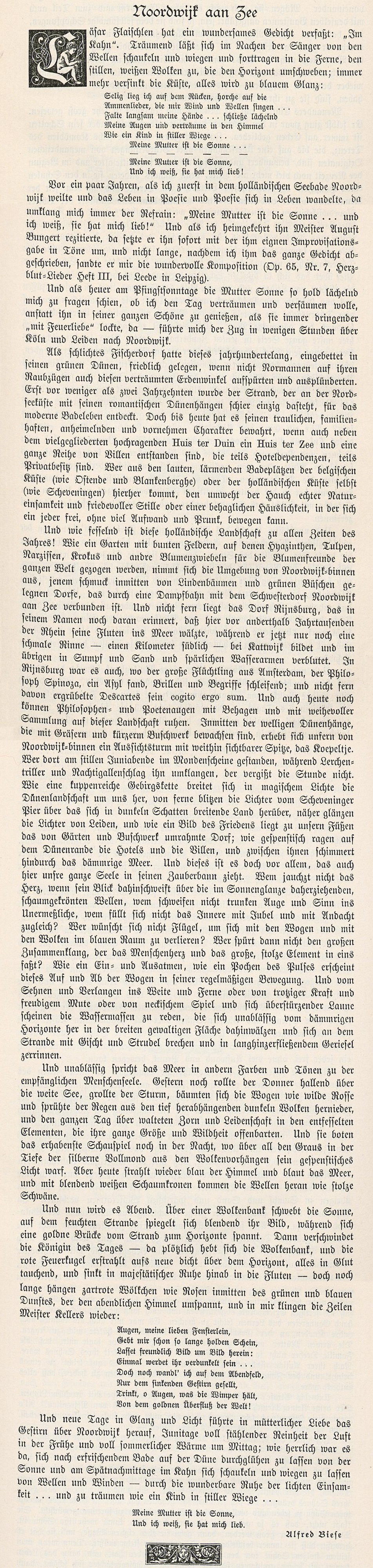 In het blad verschenen ook reisimpressies. En in een uitgave uit 1908 schreef Alfred Biese een even wervend als melancholiek verhaal over Noordwijk aan Zee. Ik ben te lui om hier het Duitse spijkerschrift integraal te gaan zitten vertalen, maar wie er zin an heeft, gaat zijn of haar goddelijke gang.