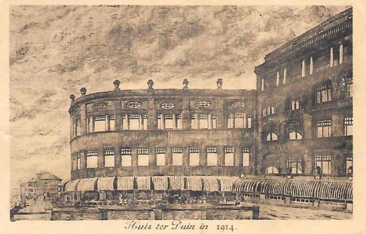 Een grafisch werkje dat Huis ter Duin verbeeldt in 1914. Tsja. Het is niet onverdienstelijk, maar er klopt weinig van. Het halfronde gebouw dat uitsteekt telde nooit meer dan twee verdiepingen (begane grond en één etage er bovenop) en het grensde niet aan het hoofdgebouw, maar aan een soort van tussengebouwtje dat men lange tijd vergeten was af te breken. Kortom, het klopt niet, maar daarmee wordt het tegelijk wel weer een bijzonder beeld.