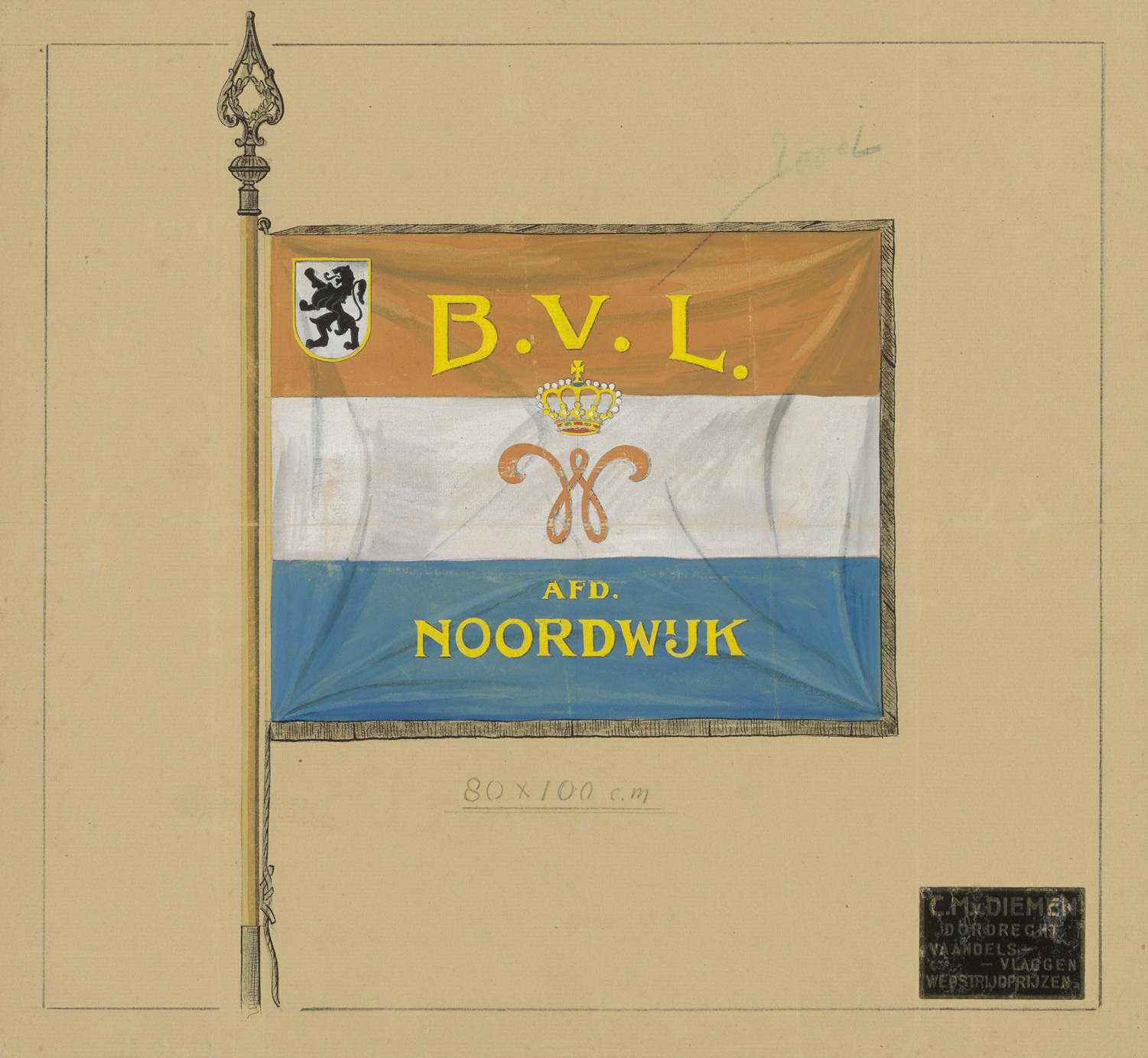Dezelfde afkorting BVL. Misschien zullen ze het vaandel nog steeds wel hebben hangen daar. Het was in ieder geval – zo blijkt uit dit archiefstuk – ontworpen en waarschijnlijk ook geproduceerd door de firma C.M. van Diemen uit Dordrecht. Het bevindt zich dan ook in het Dordts Archief.