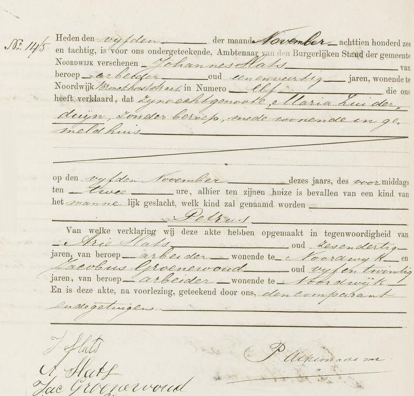 Het is vandaag precies 129 jaar geleden dat mijn grootvader geboren werd aan de Bronckhorststraat nummer 11. ’s Morgens om 02.00 uur. Zijn vader kwam nog diezelfde dag hoogstpersoonlijk aangifte doen bij de Burgerlijke Stand in Noordwijk. Dat zal dan nog wel geweest zijn in het oude Raadhuis, op de hoek van Kerkstraat en Van Limburg Stirumstraat, want het nieuwe (en huidige) raadhuis moest nog uit de grond verrijzen (de eerste steen werd pas op 14 april 1887 gelegd).