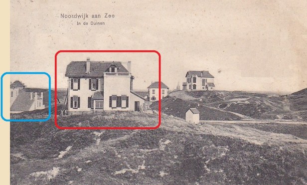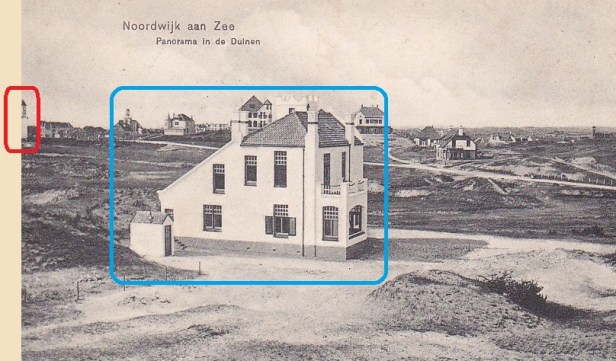 Twee kaarten uit dezelfde serie. En met twee dezelfe villa’s erop: de Villa Haufe (in rood, enkele jaren geleden in de hens gegaan) en de villa met het witte torentje dat nog steeds aan de Erasmusweg staat (in blauw).