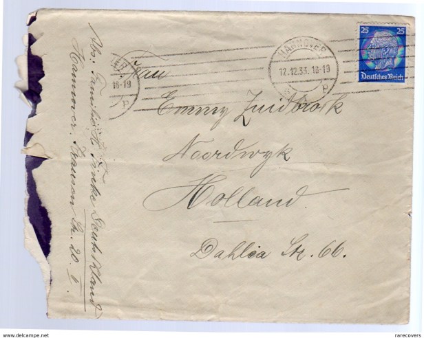 “Fuer Devise Ueberwachung zollamtlich geoeffnet.” Eind 1933 – Hitler was al aan de macht in Duitsland – werd alle post naar het buitenland door de douane gecontroleerd om te voorkomen dat er deviezen weglekten uit een land dat kampte met een giga hyperinflatie. Ook de brief aan Emma Zuidbroek uit de Dahliastraat moest er op het postkantoor van Hannover aan geloven.