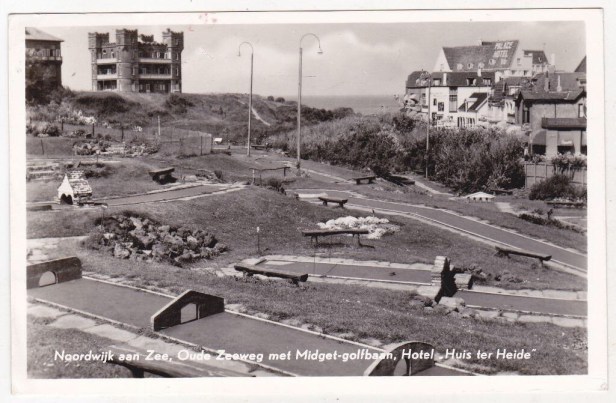 Ik krijg van Ronald deze hoogst curieuze kaart: de midgetgolfbanen bij Hotel Huis ter ……… Heide. In Noordwijk! Bedoeld is natuurlijk Huis ter Duin. Want Noordwijk heeft wel veel duin, maar helemaal geen heide.
