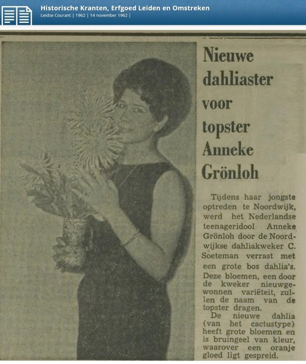 Eind 1962, toen ze wederom in De Beurs optrad kreeg ze een dahlia naar haar vernoemd, weliswaar één ‘van het cactustype’, maar toch. Het was de firma Soeteman uit Noordwijk die haar daarmee verraste. Een mooi boeket met deze “Anneke Grönloh Dahlia’s” zou niet misstaan op haar kist.