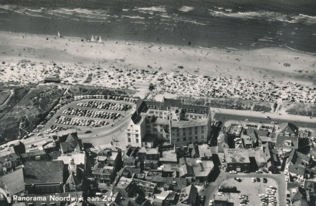 Een schitterende foto (met dank aan Willem van den Haak) van een zomerse dag in Noordwijk aan Zee, ergens in de Jren Zestig (denk ik) van de vorige eeuw. Centraal staat het oude Palace Hotel als een ware burcht op de kop van het oude dorp. Veel mensen op het strand, auto’s op de parkeerterreinen. Happen naar heimwee.