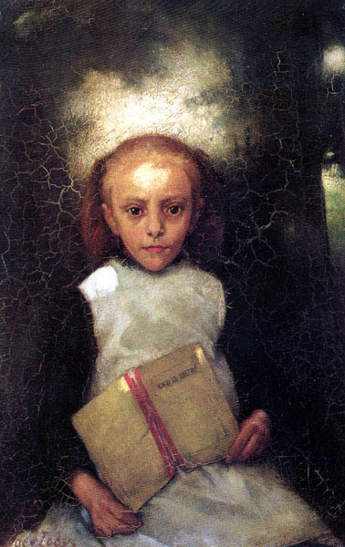 Hoe het schilderij bij de Verwey’s was beland laat zich raden: Van Looy en Verwey maakten beiden deel uit van de redactie van de Nieuwe Gids (tot 1890) en ze hadden overlappende vriendenkringen, waartoe onder meer behoorden Willem Witsen, Jan Veth en Eduard Karsen. Misschien had Verwey het schilderij van Van Looy gekocht of had hij het gekregen. Veel verder dan dat kan ik het niet beredeneren.Ik zou het portret trouwens niet boven mijn schoorsteenmantel hebben willen hangen. Ik vind het een wat angstaanjagend beeld, een eng meisje dat wezenloos naar buiten kijkt in een vreemde lichtkrans tegen een donkere achtergrond. En dan dat ‘God is Liefde’ op het boekje. Het gevoel naar een dood-kind-met-open-ogen te kijken.