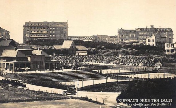 Propagandakaart van Huis ter Duin, waarmee men suggereerde dat ook de Casino-tennisbanen bij het fameuze hotel zouden horen. Quod non. Opvallend is wel dat twee HtD-gebouwen vrijwel op de tennisbanen stonden: het bloembollenbedrijf van Huis ter Duin en het gebouwtje Oud-Holland.