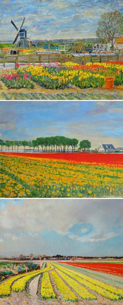 Drie expressieve schilderijen van rond 2011, gemaakt in Noordwijk door de schilderes Hubertune Heijermans (geboren te Amsterdam 1936). Met bovenaan de Hoogewegse molen. Ik weet niet of zij nog steeds schildert. Gisteren is zij in ieder geval bij leven en welzijn 83 jaar oud geworden.