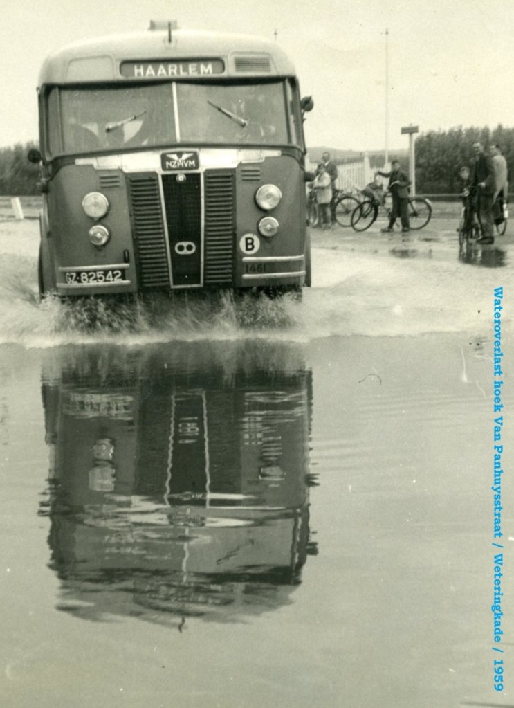 Soms – bij heftige hoosbuien – stroomde het water op tsunamische wijze van de Quarles en de Van Panhuys in Noordwijk naar beneden en werd de bus naar Haarlem op de Weteringkade door de wateren ingehaald.
