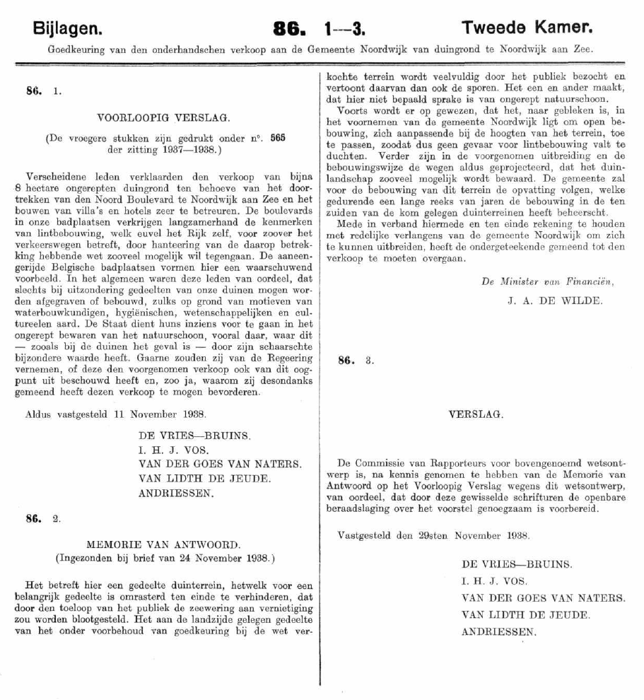 Tweede Kamerleden (en niet de geringsten) maakten zich in november 1938 zorgen over de mogelijke lintbebouwing aan de Noordwijkse kust. Aanleiding was blijkbaar de verkoop door het Rijk van duingronden ten noorden van de Vuurtoren aan de gemeente Noordwijk. Volgens de minister van Financiën viel het allemaal wel mee, zou de gemeente Noordwijk er geen potje van maken en was een stuk van het duin toch al vertrapt door – waarschijnlijk bramenzoekende – autochtonen.