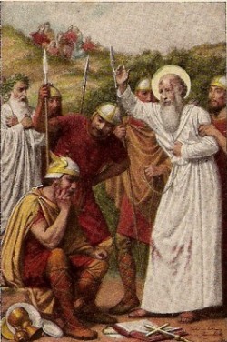 Als je niet zou weten dat hier de Heilige Jeroen is afgebeeld, zou je bijna gaan denken aan een plaatje uit Asterix en Obelix: alom Romeinse soldaten en helemaal links een heuse druïde. Die laatste speelt hier wellicht nog wel dezelfde rol als in Gallië en staat symbool voor het ongekerstende heidendom. De ‘Romeinen’ zijn Noormannen die weldra Jeroen zouden doden en hem daarmee zouden verheffen tot het martelaarschap en de eeuwige zaligheid. Het speelde zich af in – ik meen – het jaar 867.