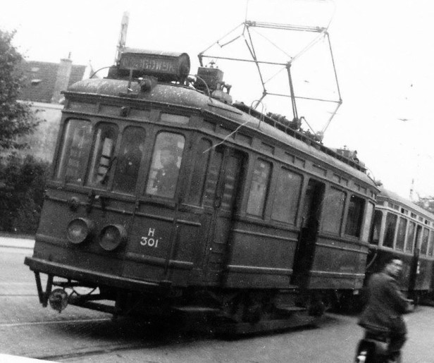 De H301 is grijs. Hij is met dat nummer gedegradeerd tot werkwagen en draagt nu dus zijn derde jas. De eerste jas was crème, de tweede blauw – licht grijs en deze derde jas werkwagengrijs. Hier is hij aan het rangeren op de Rijnsburgerweg in Leiden.