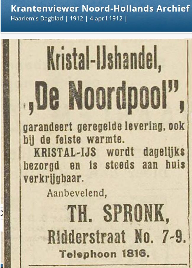 Links een reclamebord voor ‘kristal-ijs’ van de Wed. Th. Spronk uit Haarlem. Het ging daarbij niet om roomijs, maar om ijs, waarmee men groente en vlees tenminste een beetje vers kon houden, ‘ook bij de felste warmte’. Onderstaande advertentie getuigt daarvan. Die advertentie is van 1912 en de oude Th. Spronk moet vóór 1935 zijn overleden, want toen was – getuige eerdergenoemd reclamebord – de handel overgegaan naar de Weduwe Spronk.