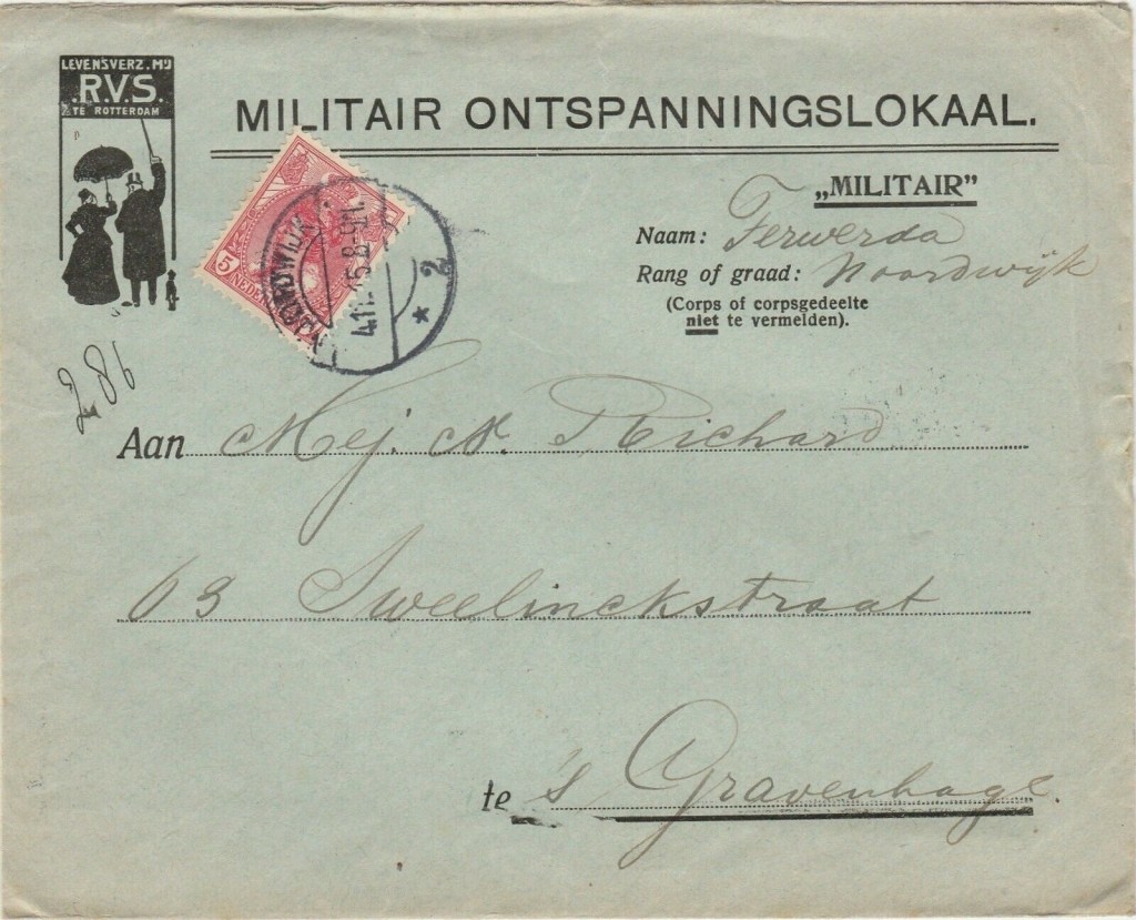 Waar het ‘militair ontspanningslokaal’ precies was in Noordwijk gedurende de mobilisatie voor de Eerste Wereldoorlogweet ik niet. Soldaat Ferwerda maakte in ieder geval wel gebruik van het postpapier om zijn geliefde in Den Haag een brief te schrijven (gesponsord door RVS-verzekeringen blijkbaar).