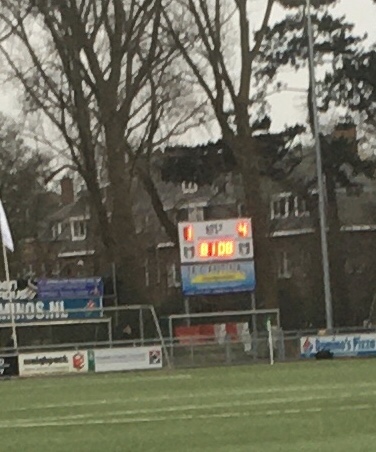 Zaterdag 11 januari 2020. Scorebord op Houtrust in Den Haag tijdens svv Scheveningen tegen vv Noordwijk. Eindstand was al in de 81e minuut bereikt.