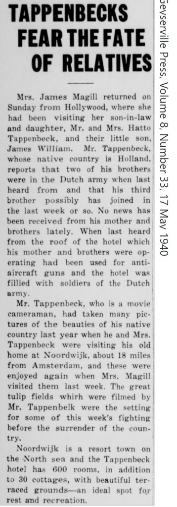 Hatto Tappenbeck is hier wel eens vaker voorbij gekomen. Hij was een broer van de Wolfgang en Rudolph Tappenbeck, allemaal deel uitmakend van de Huisterduinse Tappenbeckdynastie. Hatto was al vóór de oorlog geëmigreed naar de Verenigde Staten en belandde via Palo Alto uiteindelijk in Los Angeles, waar hij zich ontwikkelde tot cameraman in Hollywood.