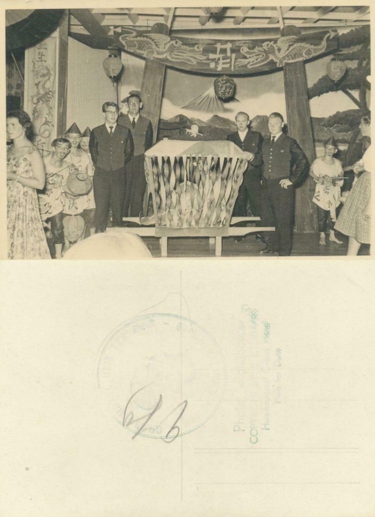 Het is een foto van een feestje, waarschijnlijk in Huis ter Duin. Want – voor zo ver ik het allemaal nog kan ontcijferen aan de hand van een stempel op de achterzijde – de foto is gemaakt door “de huisfotograaf van Grand Hotel Huis ter Duin.” Wie dat ook gewezen moge zijn en bij welke gelegenheid hij of zij deze foto ook heeft gemaakt.